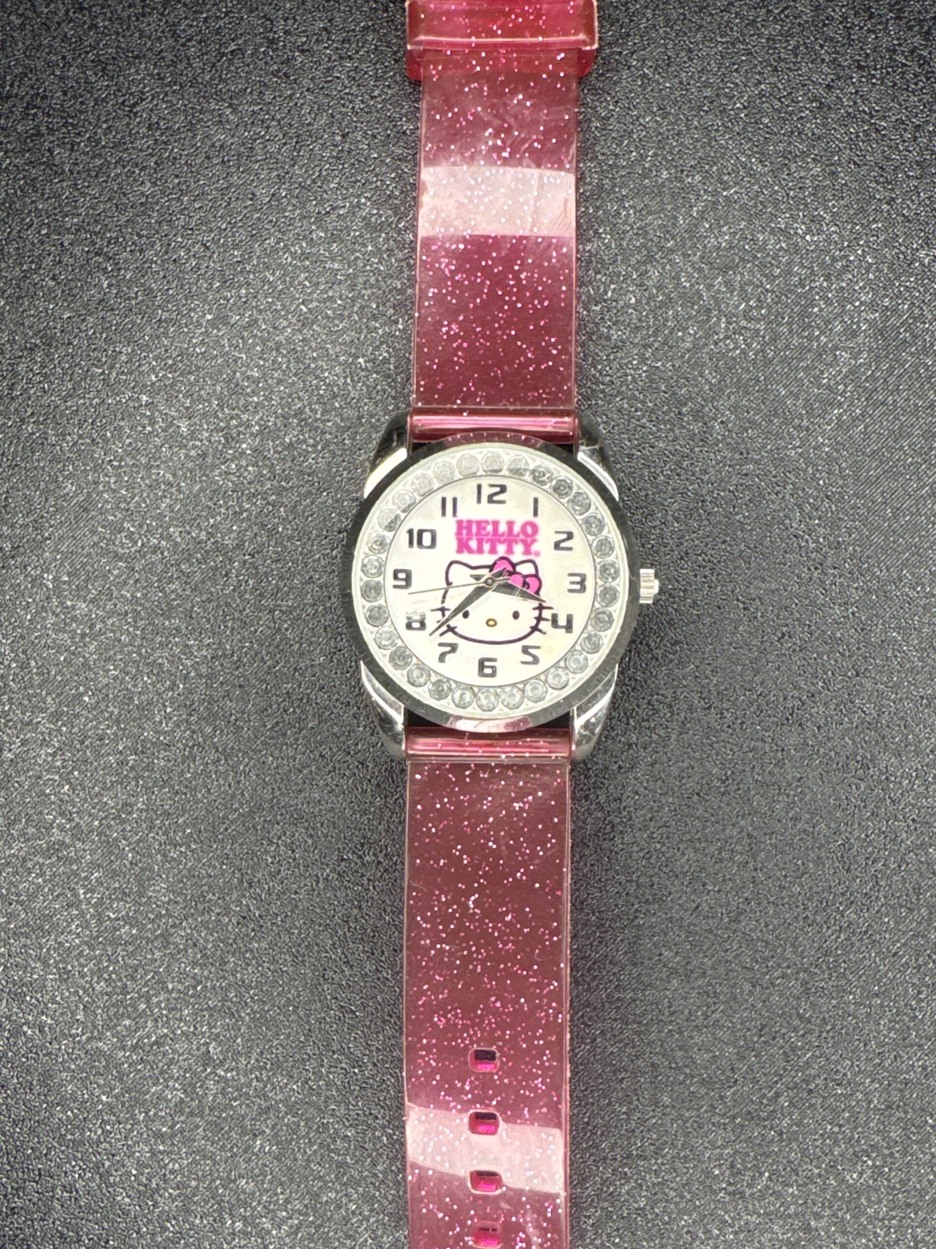 Discover the charming Sanrio Hello Kitty women’s watch with a pink glitter strap and rhinestone bezel, perfect for adding a playful touch to any outfit.