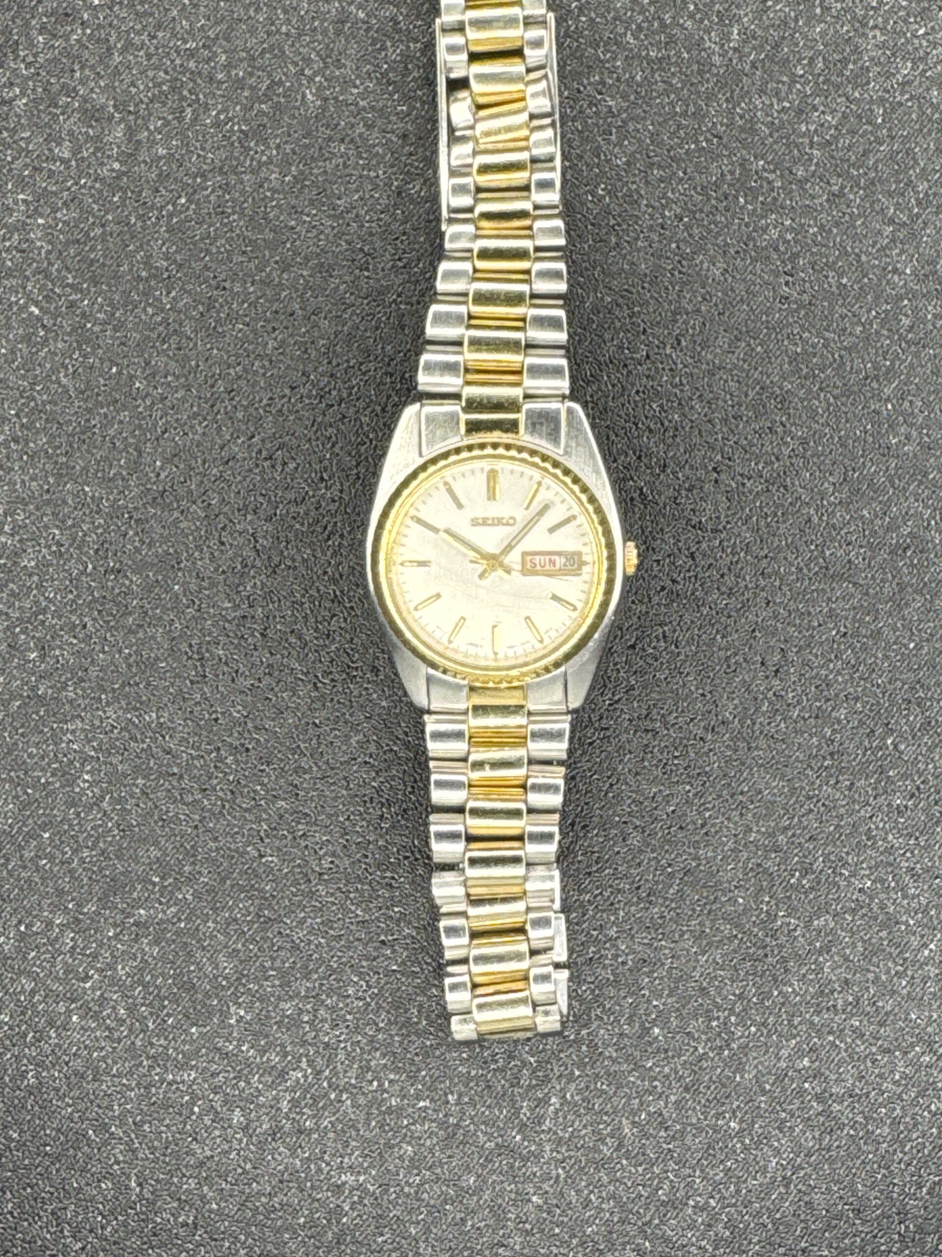 This Seiko Day Date Quartz women’s watch features a classic design with a two-tone stainless steel bracelet and case. The dial is silver with gold-tone hour markers and hands, and it includes a day-date complication at the 3 o’clock position. The watch is powered by a quartz movement, ensuring accurate timekeeping. The back of the watch shows signs of wear, with visible scratches, but the overall condition remains functional.