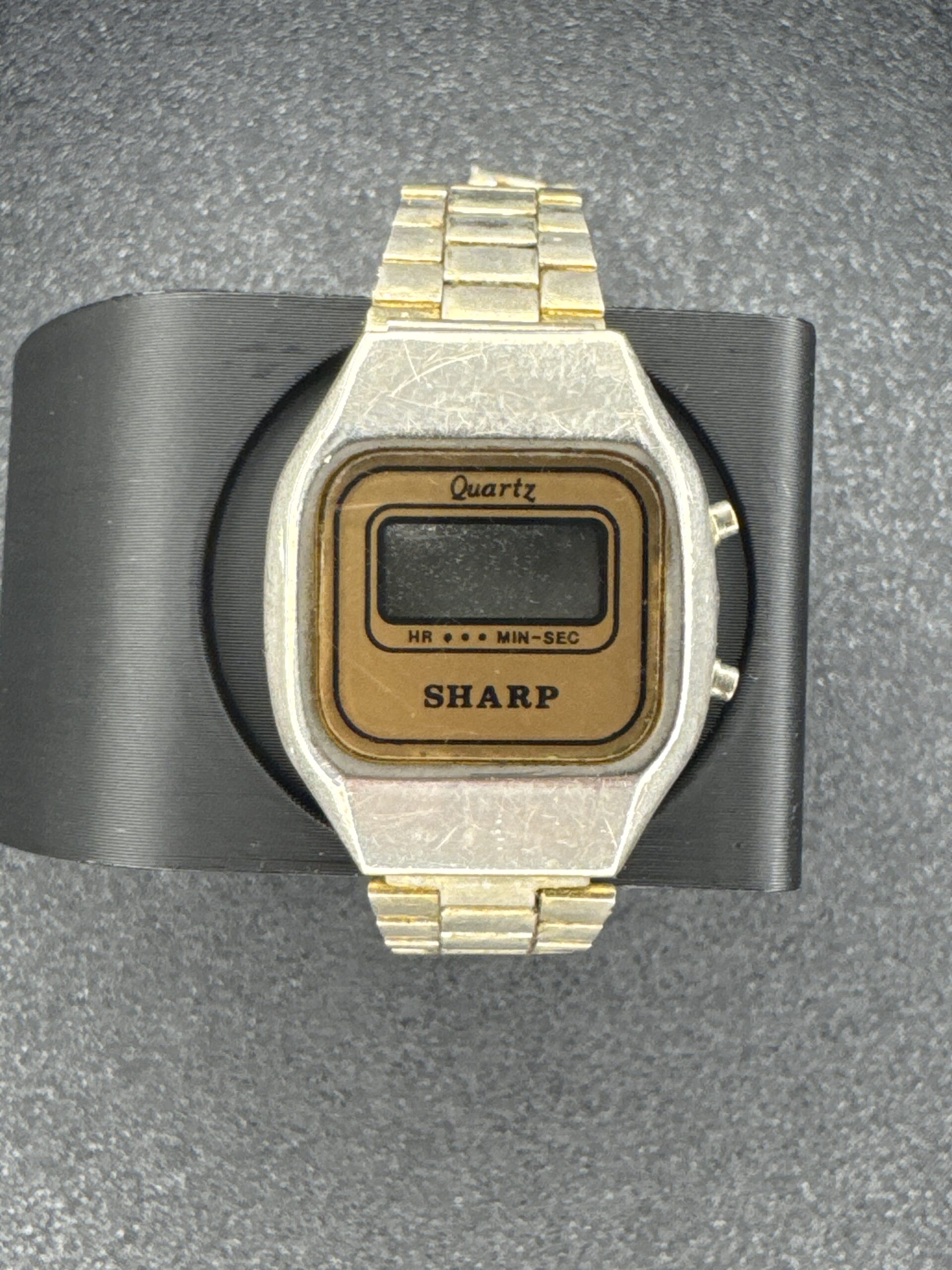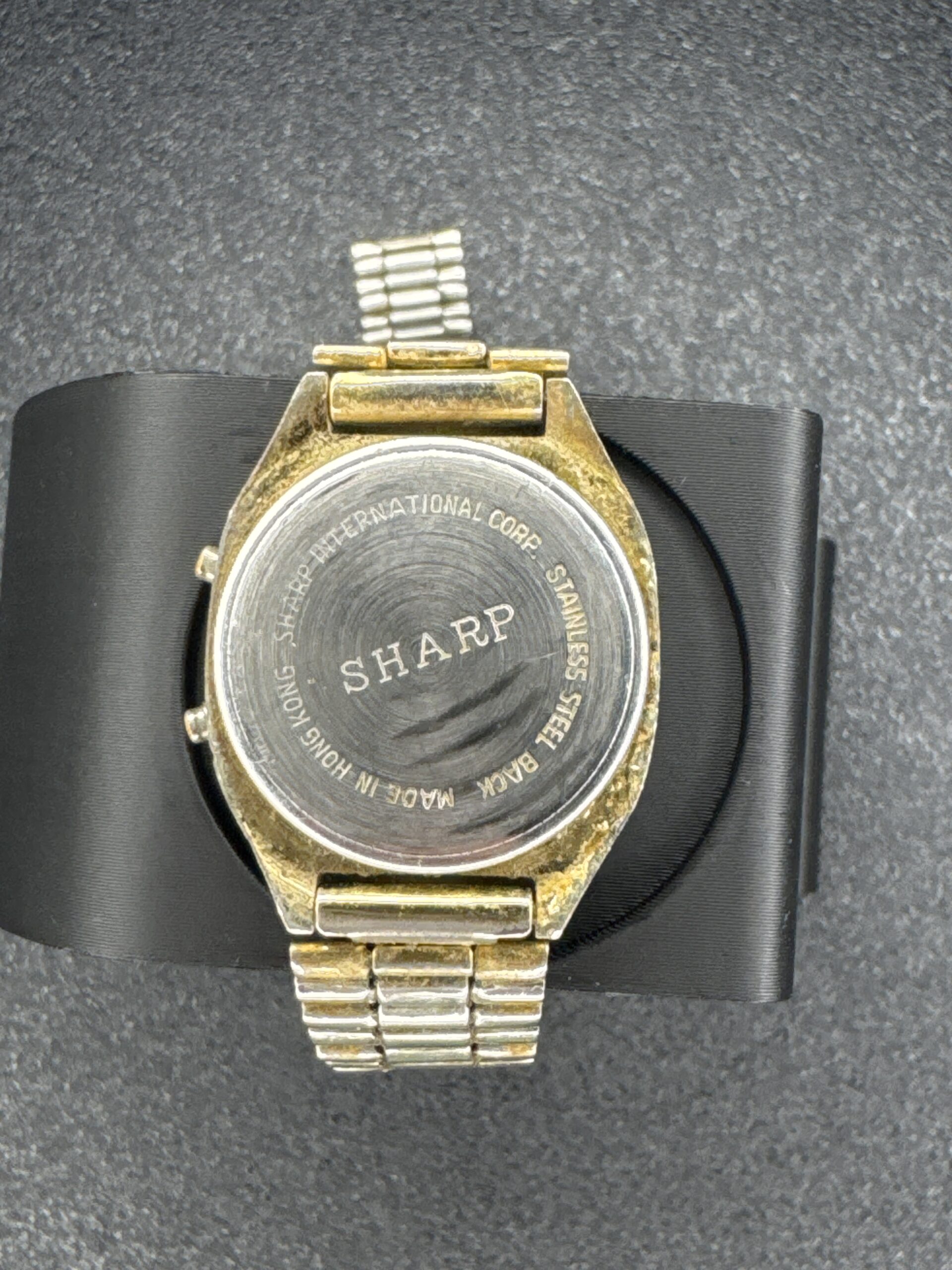 Vintage Sharp quartz digital women’s watch with gold-tone bezel and stainless steel back. Features a digital display for hours, minutes, and seconds.