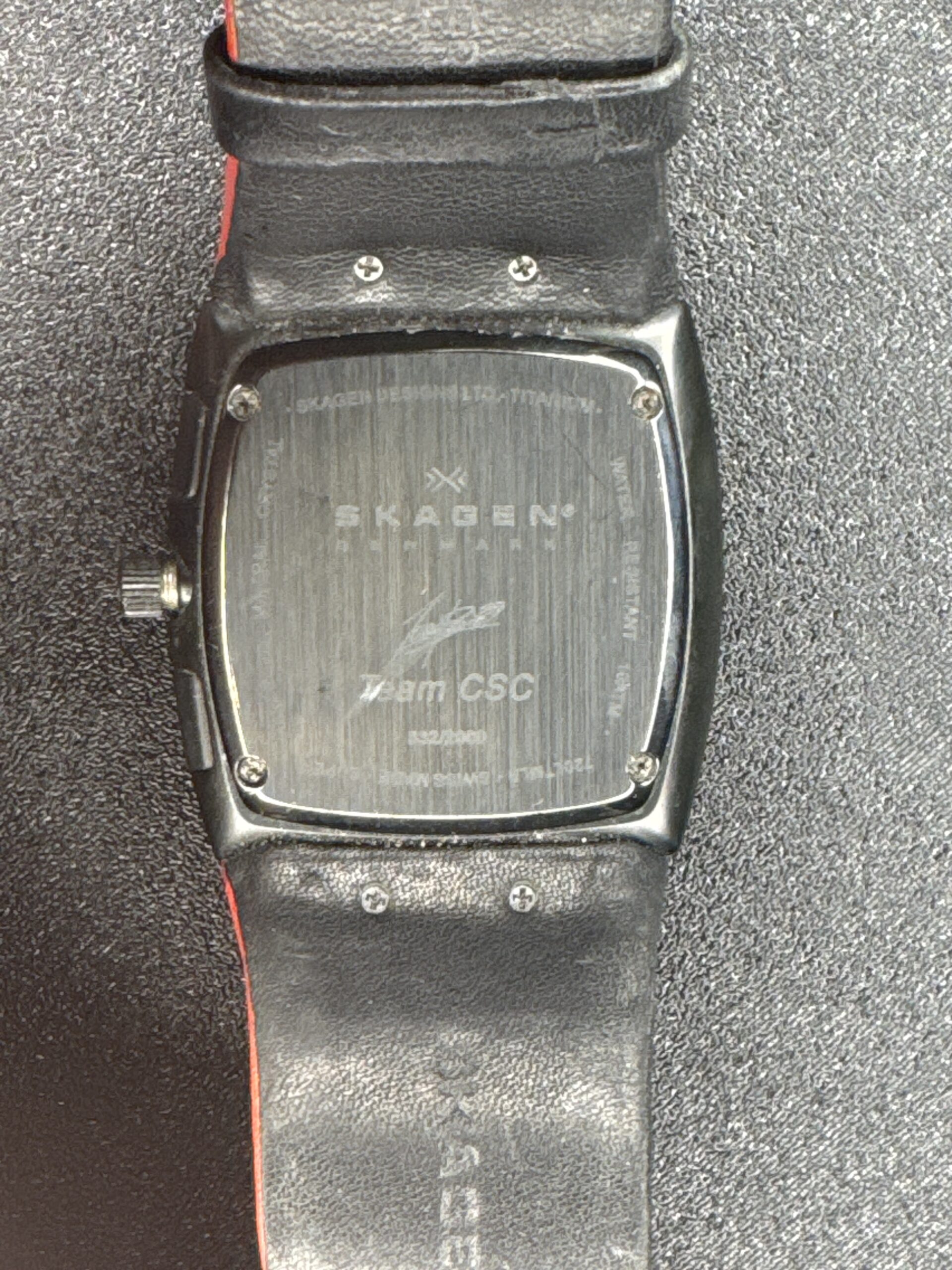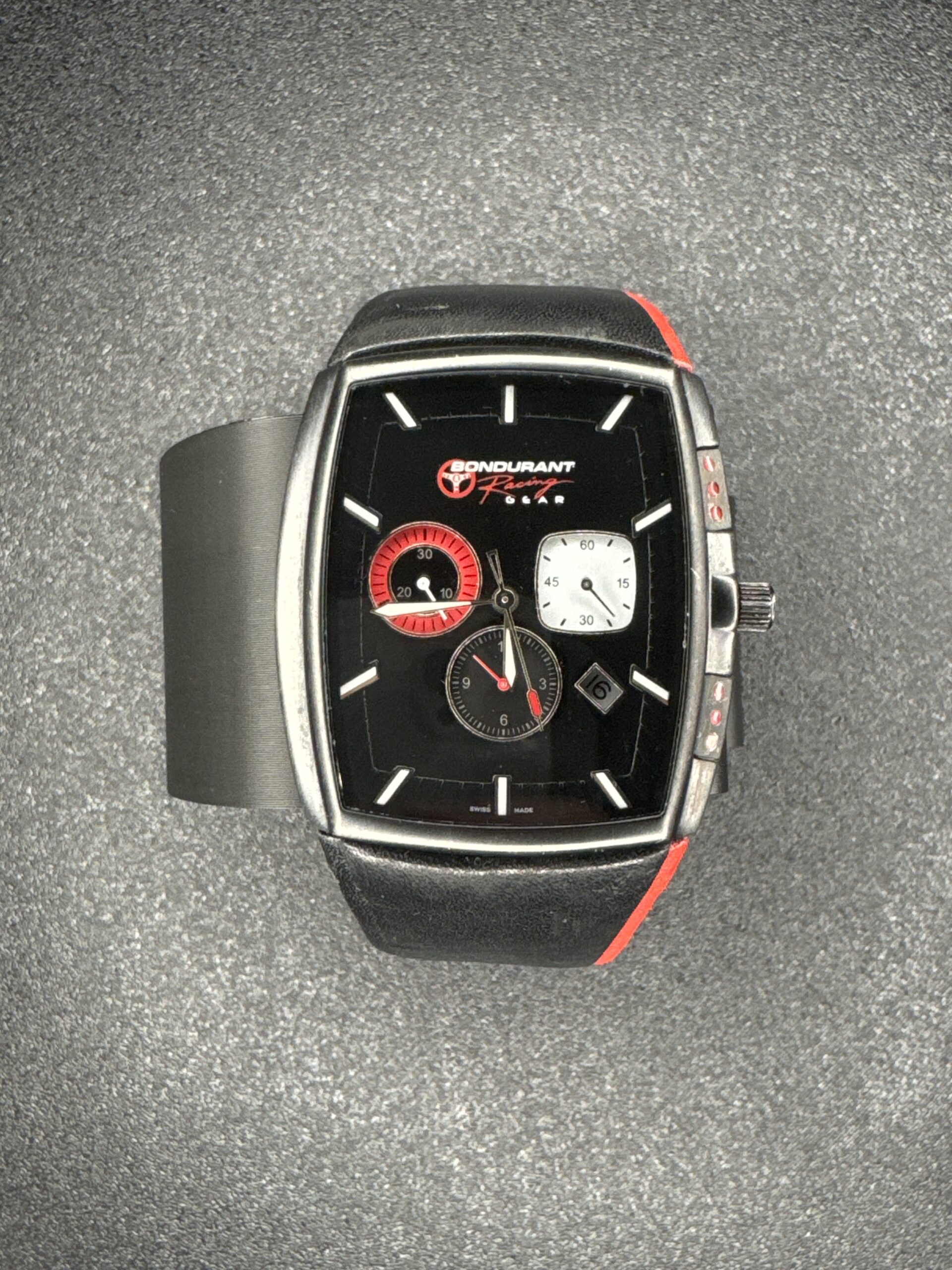 The Skagen Bondurant Racing Watch is a men’s chronograph with a distinctive racing-inspired design. The watch features a rectangular stainless steel case with a black dial, accented by red and white subdials and a date window. The dial is marked with the Bondurant Racing logo, adding to its sporty appeal. The strap is black leather with red accents, complementing the overall aesthetic. The back of the watch is engraved with ‘Team CSC’ and is limited edition, numbered 102/300. The watch is Swiss-made, indicating high-quality craftsmanship.