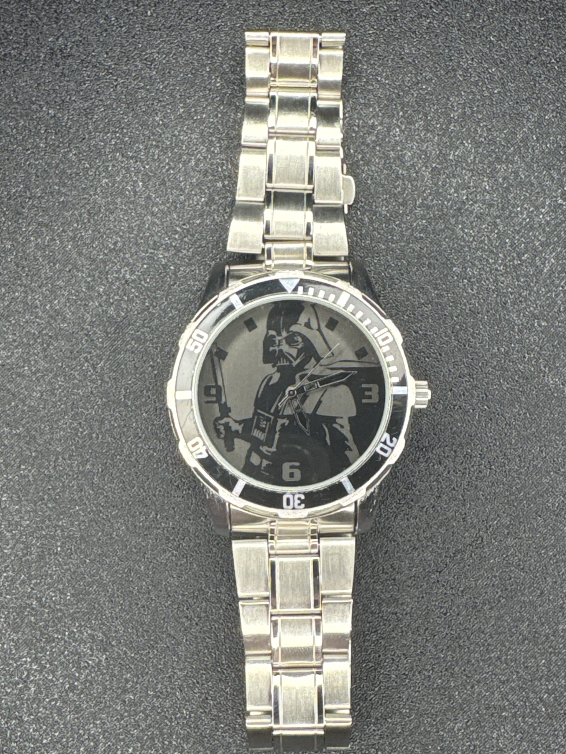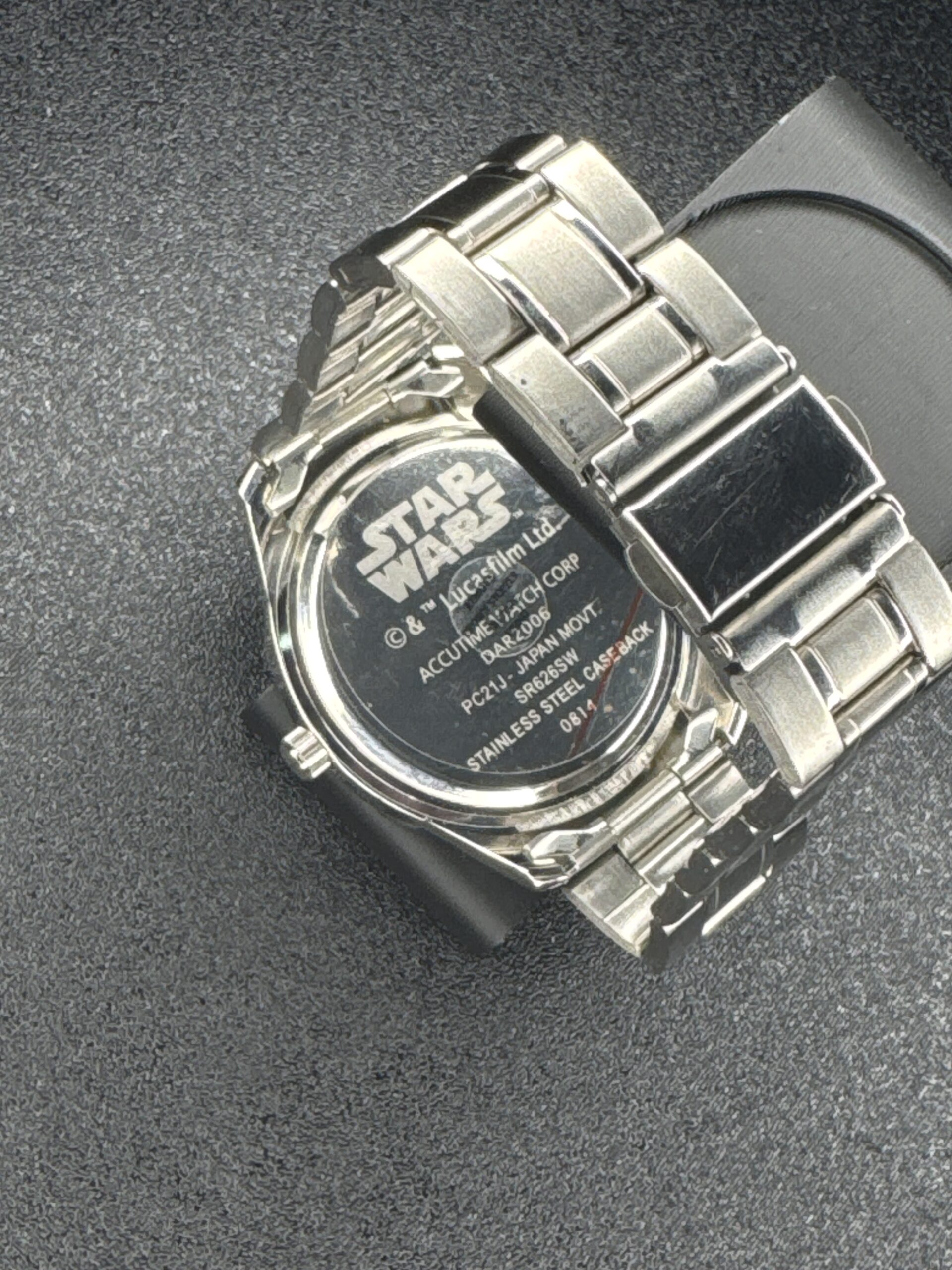 This is a Star Wars-themed men’s wristwatch featuring a Darth Vader design on the dial. The watch has a stainless steel case and bracelet, providing a sleek and durable look. The bezel is marked with minute indicators, and the dial includes hour markers at 3, 6, 9, and 12. The back of the watch features the Star Wars logo and details about the movement and materials used.