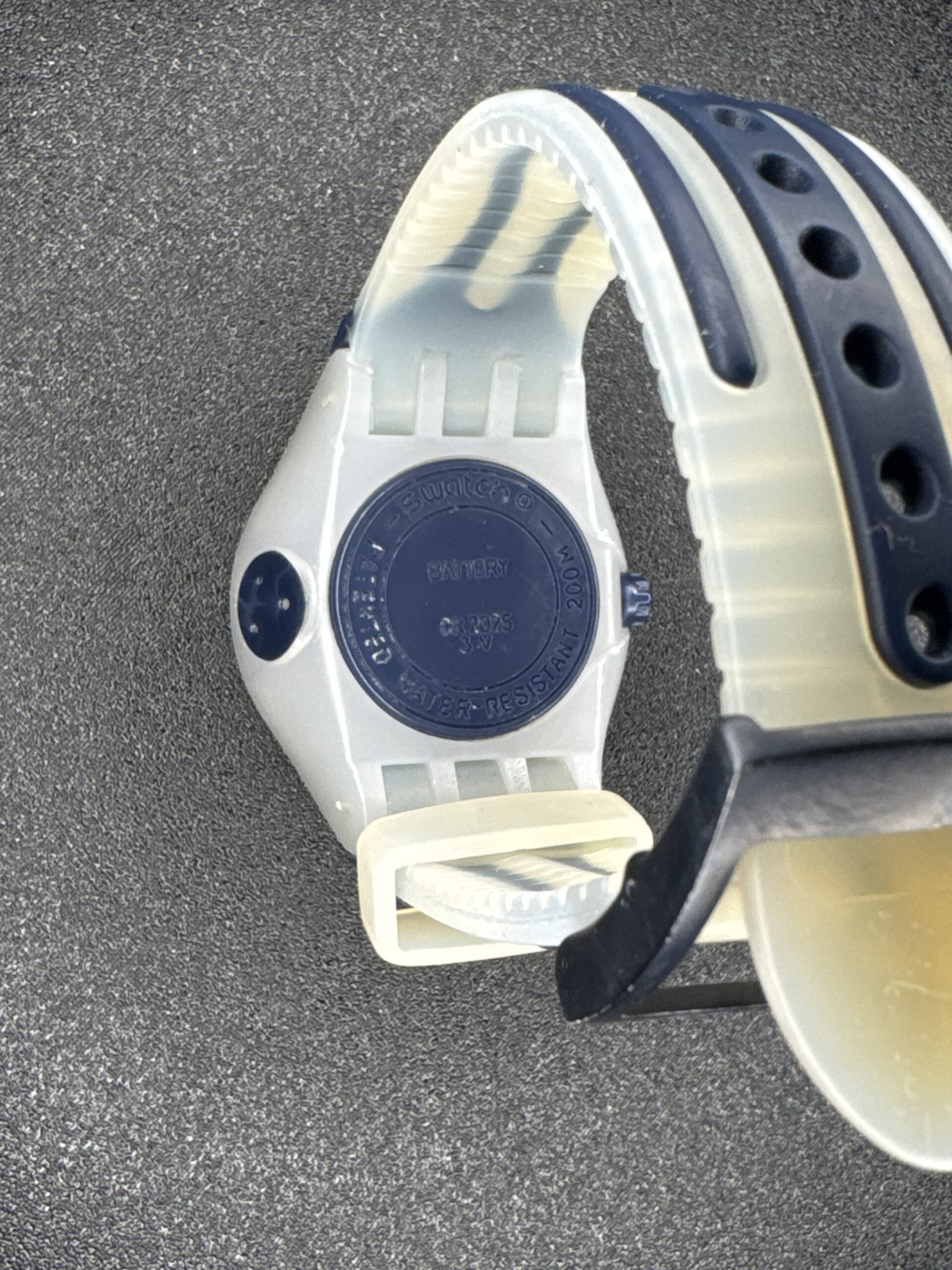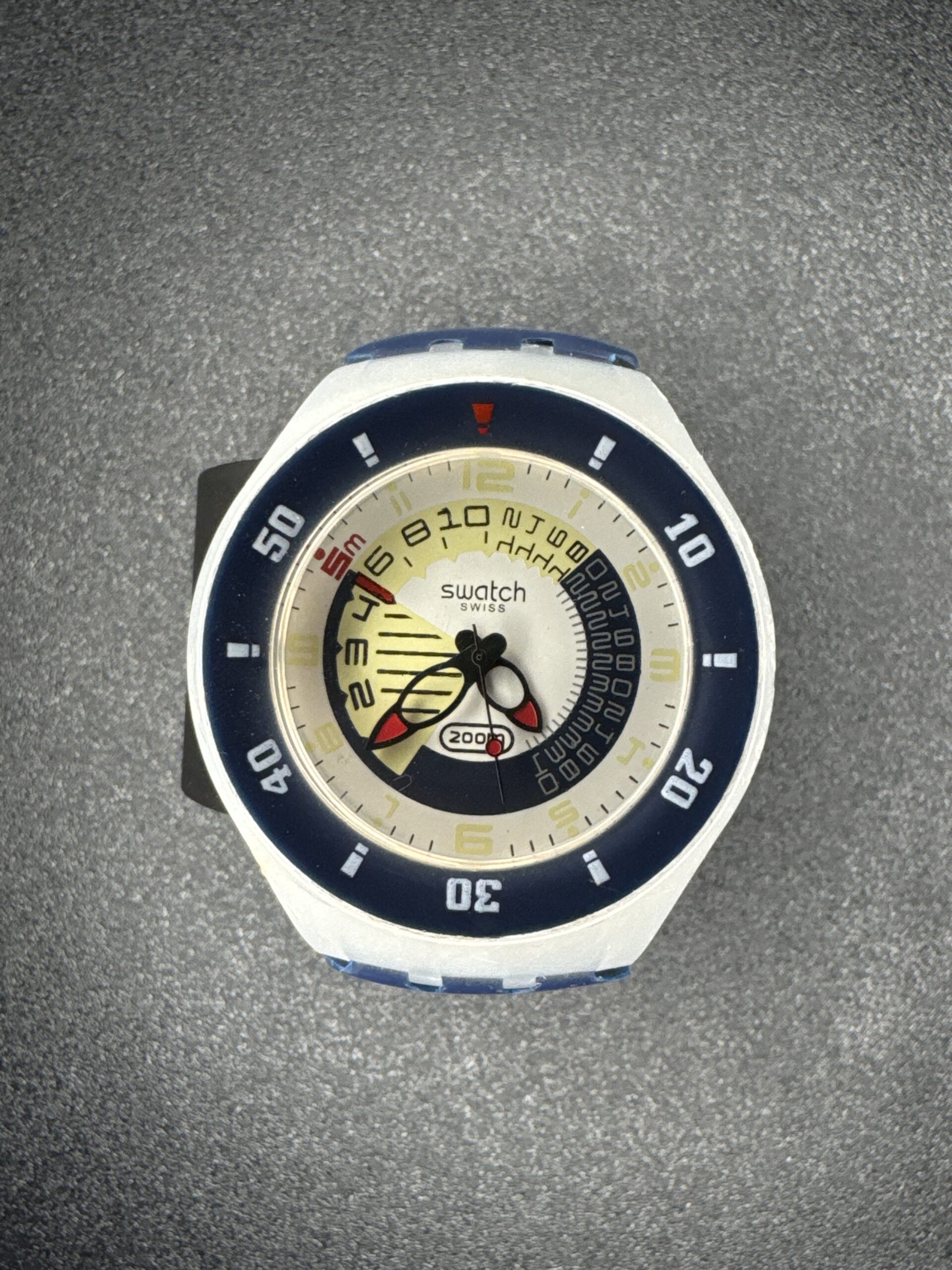 This Swatch Swiss men’s watch features a bold design with a blue and white color scheme. The dial includes a unique combination of numerals and markers, with a prominent 200M water resistance indication. The bezel is unidirectional, typical for diver watches, and the watch is equipped with a durable strap. The back showcases the Swatch branding and water resistance details.