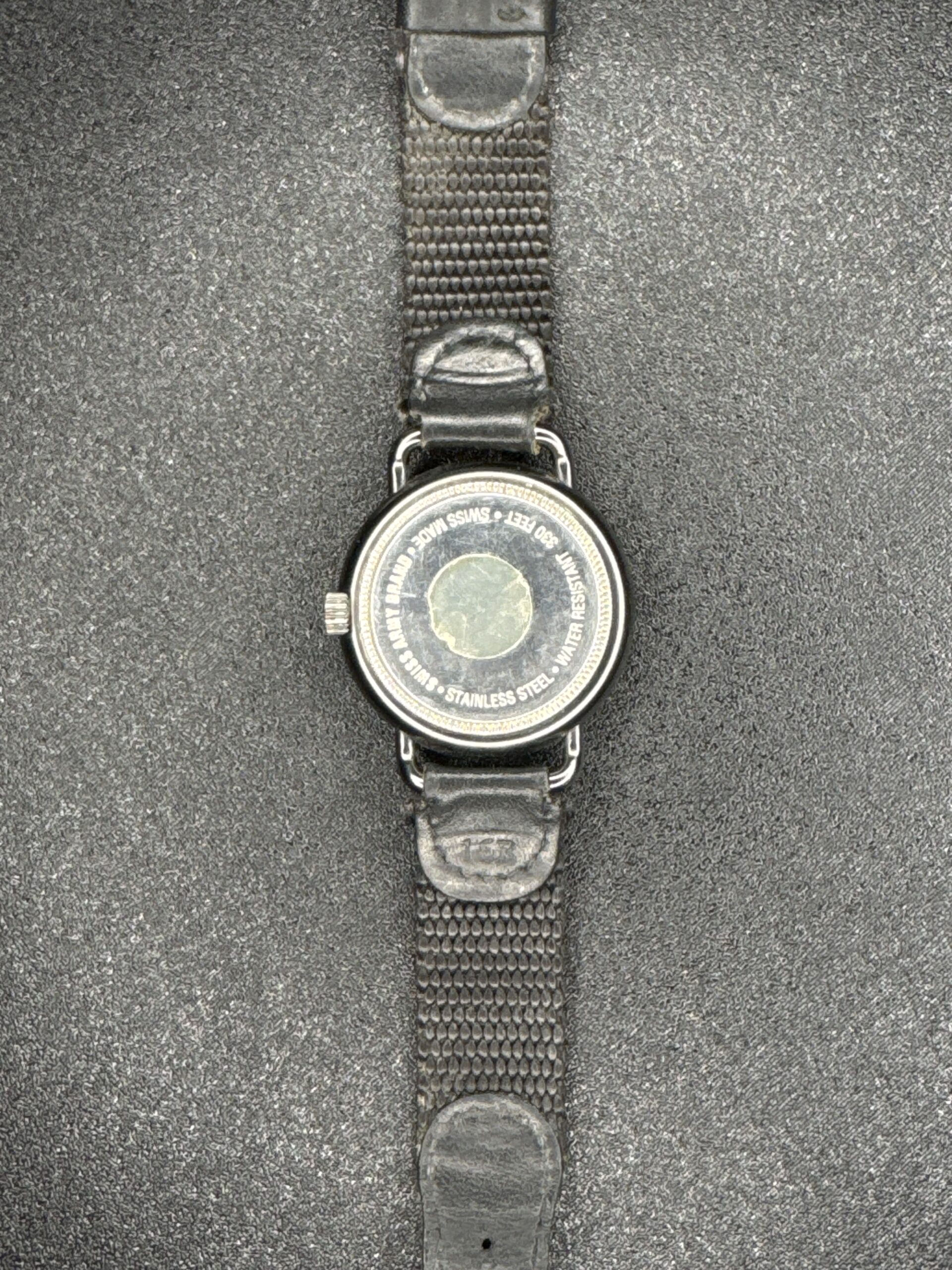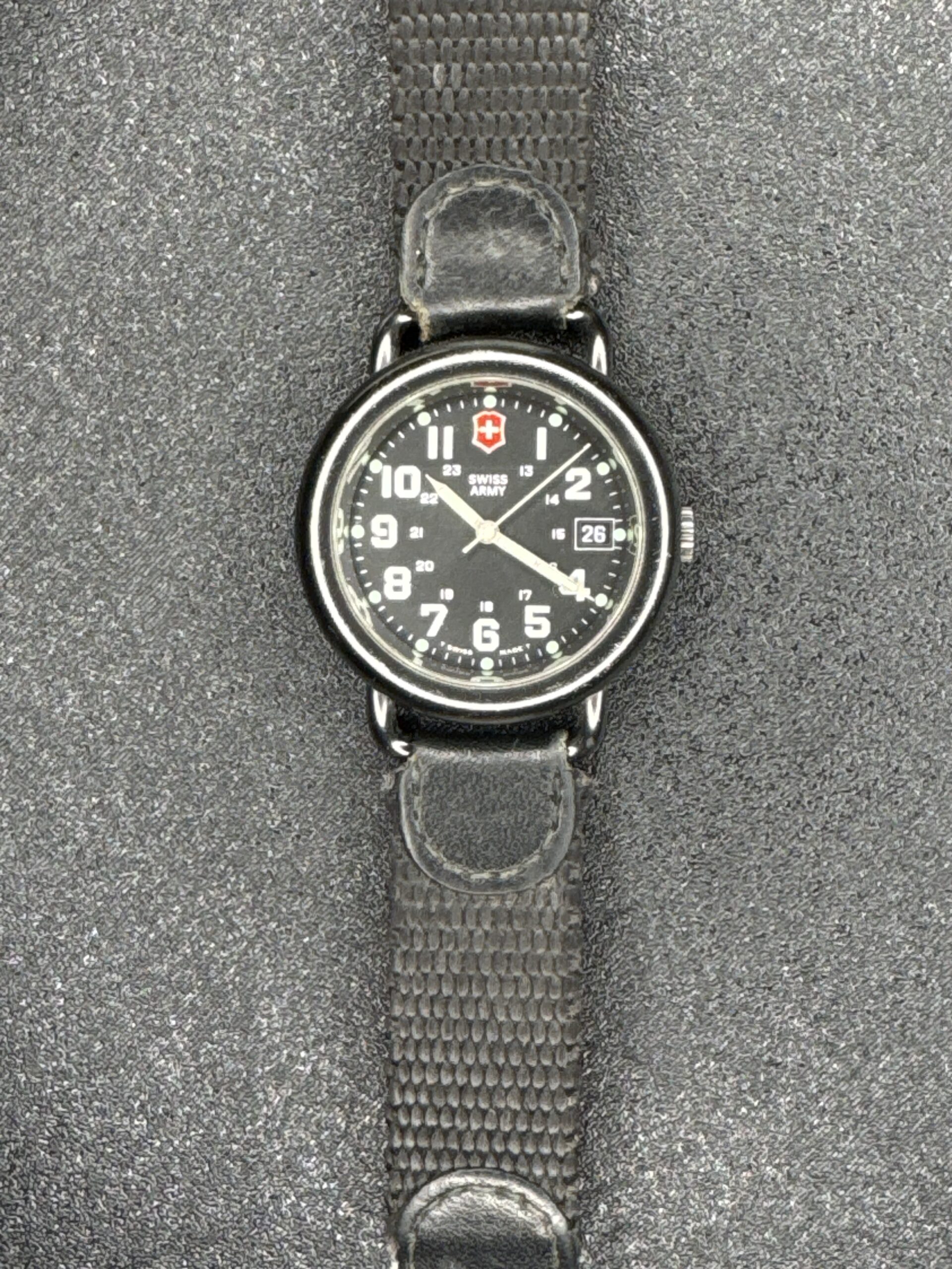 This Swiss Army men’s watch features a classic military-inspired design with a black dial and glow-in-the-dark (GITD) hands and markers for enhanced visibility. The watch includes a date function located at the 3 o’clock position. The case is made of stainless steel, providing durability and water resistance. The strap appears to be made of a rugged fabric material, suitable for outdoor use. The back of the watch shows signs of wear, with some scratches and fading, indicating regular use.