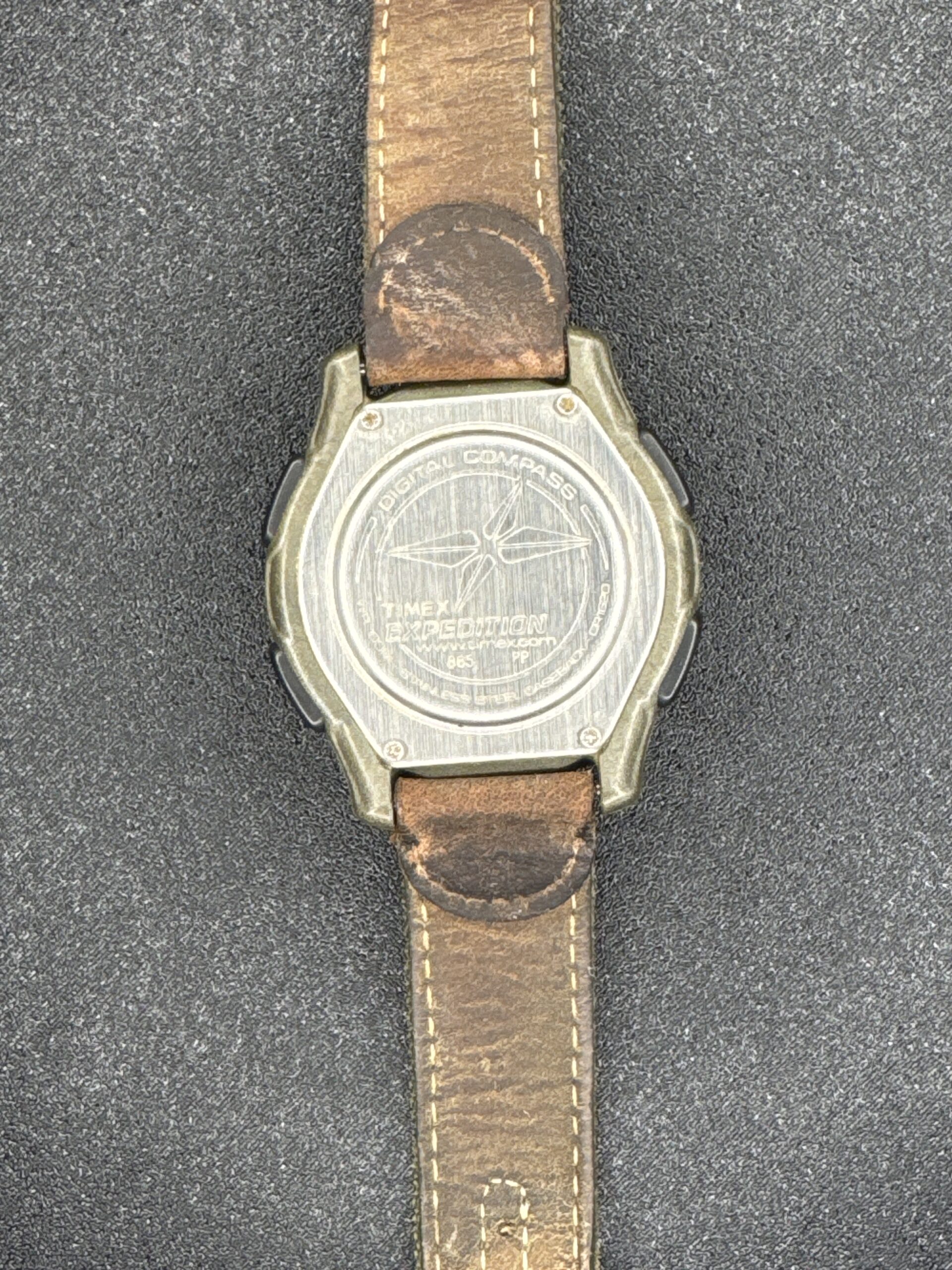 The Timex Expedition Men’s Digital Watch features a rugged design with a digital compass and Indiglo backlight. The watch face shows signs of wear, with scratches visible on the crystal. The case is made of durable resin, and the strap is a combination of fabric and leather, showing significant wear and discoloration. The back of the watch is engraved with the Timex Expedition logo and model details.