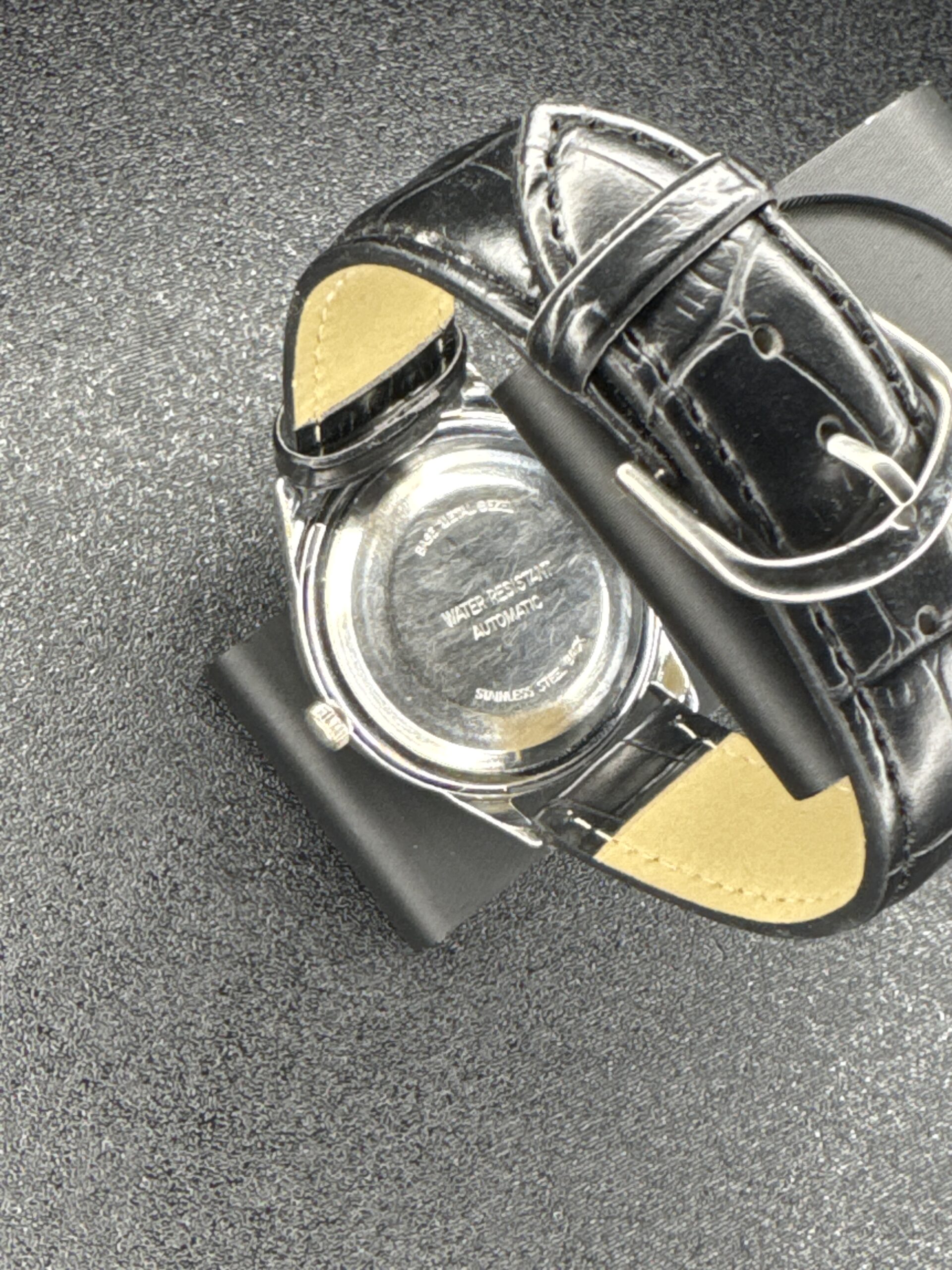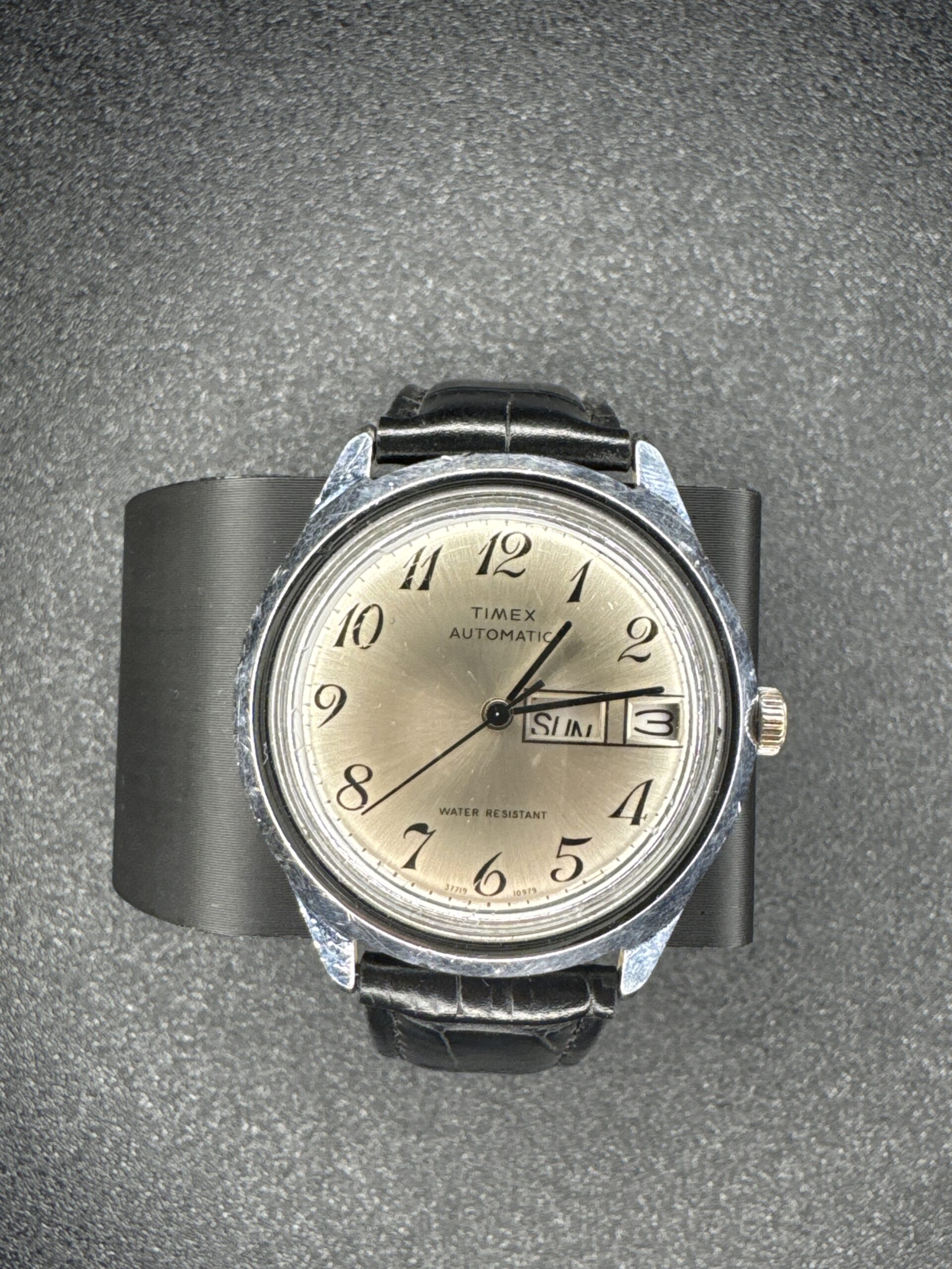 This Timex Automatic Date men’s watch features a classic design with a silver-tone dial and Arabic numeral hour markers. The day-date function is prominently displayed at the 3 o’clock position. The watch is water-resistant and has a stainless steel case, as indicated on the back. The black leather strap adds a touch of elegance. The case shows signs of wear, with noticeable scratches and some tarnishing, typical for a vintage piece.