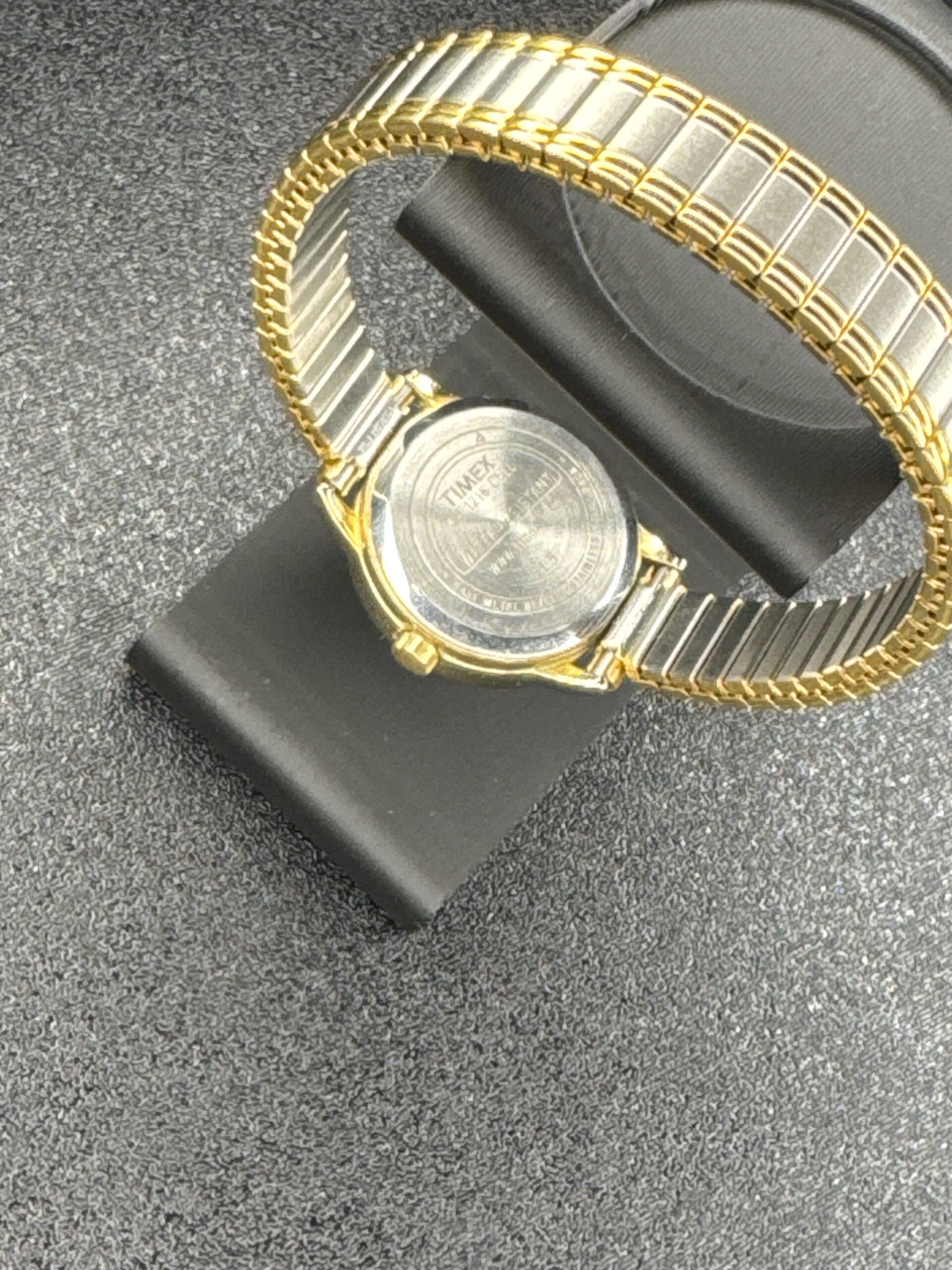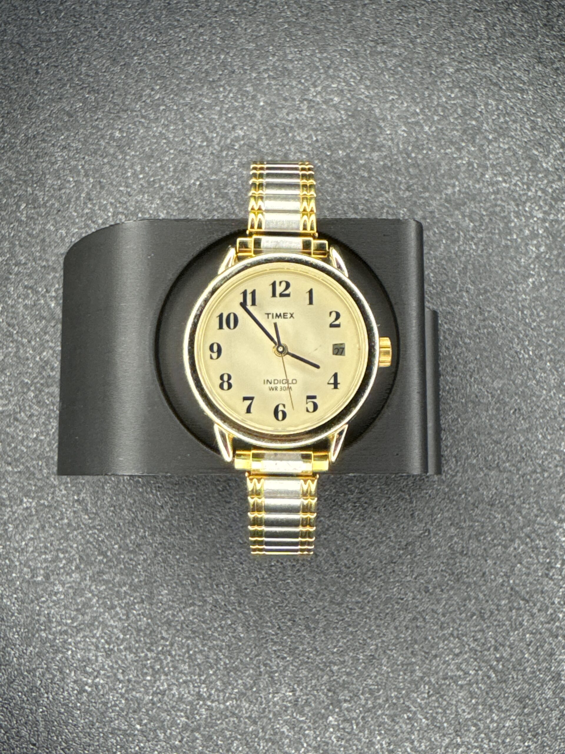 This Timex Indiglo women’s watch features a classic round case with a gold-tone finish and a date window at the 3 o’clock position. The dial is cream-colored with black Arabic numerals and hands, offering a clear and easy-to-read display. The watch is equipped with the Indiglo night-light feature for visibility in low light conditions. The two-tone stainless steel bracelet adds a touch of elegance, combining gold and silver tones. The back of the watch shows typical wear, consistent with regular use.