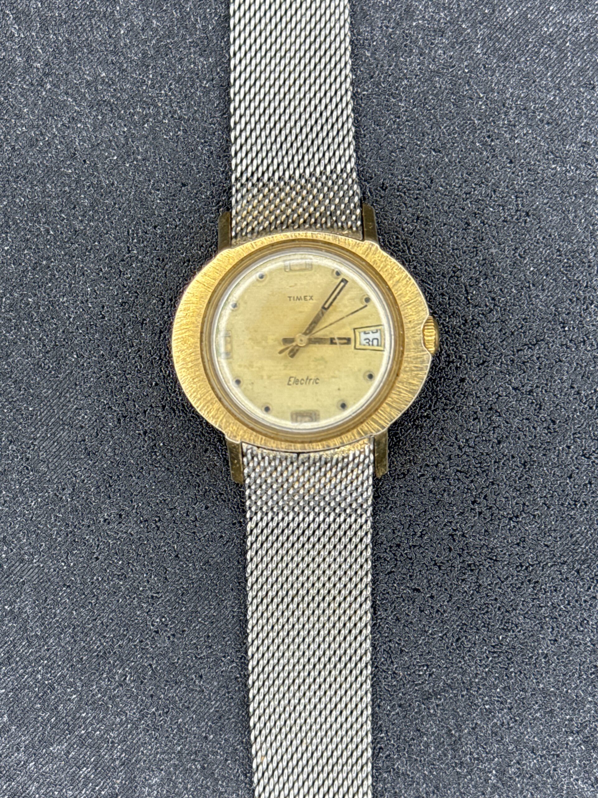 Explore this vintage Timex Electric Date women’s watch with a gold-tone case and mesh bracelet. A classic timepiece with a date function.
