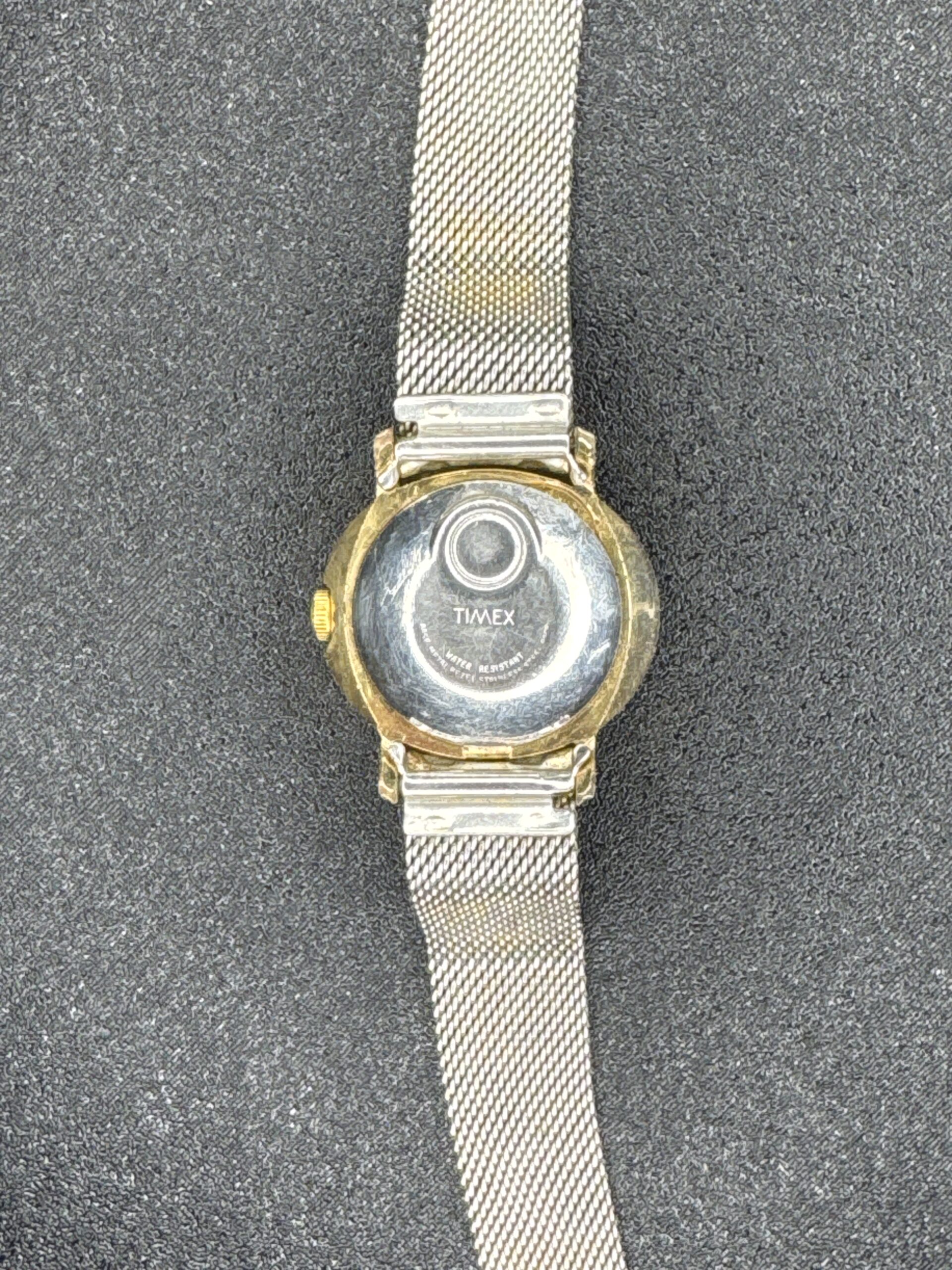This vintage Timex Electric Date women’s watch features a gold-tone case with a textured bezel and a mesh stainless steel bracelet. The dial is a warm cream color with simple hour markers and a date window at the 3 o’clock position. The hands are gold-toned, complementing the case. The back of the watch is stainless steel with the Timex logo and model information engraved. The watch shows signs of wear, with some patina on the dial and minor scratches on the case and bracelet, typical for a watch of its age.
