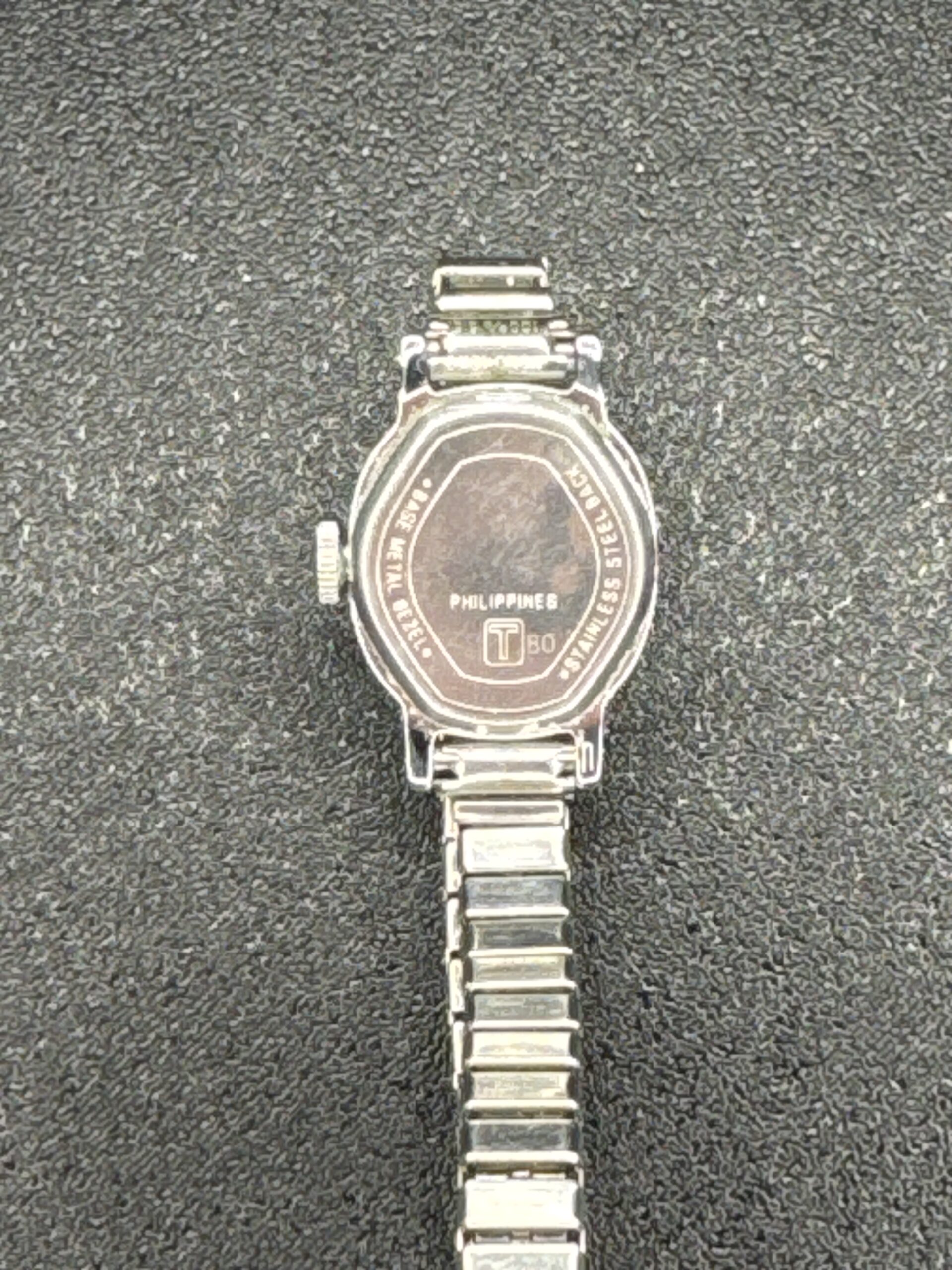 This is a vintage Timex mechanical women’s watch featuring a small, oval-shaped case and a classic dial with Arabic numerals. The watch has a stainless steel bracelet and a manual winding movement. The dial is simple and elegant, with a minimalist design. The back of the watch indicates it was made in the Philippines and has a stainless steel back.