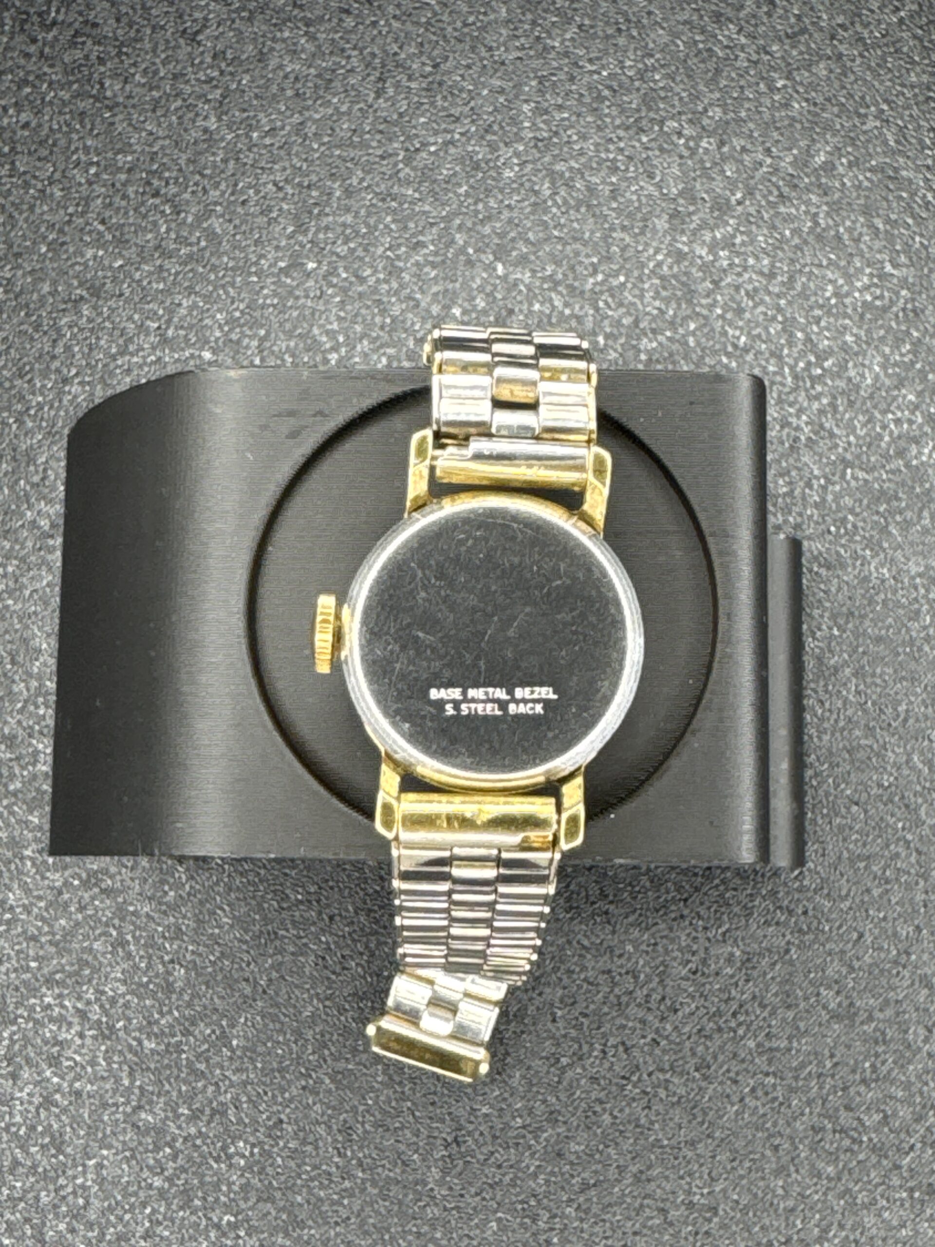 Explore this vintage Timex mechanical women’s watch with a wind-up movement, gold-tone case, and stainless steel back. A classic timepiece with a textured dial.