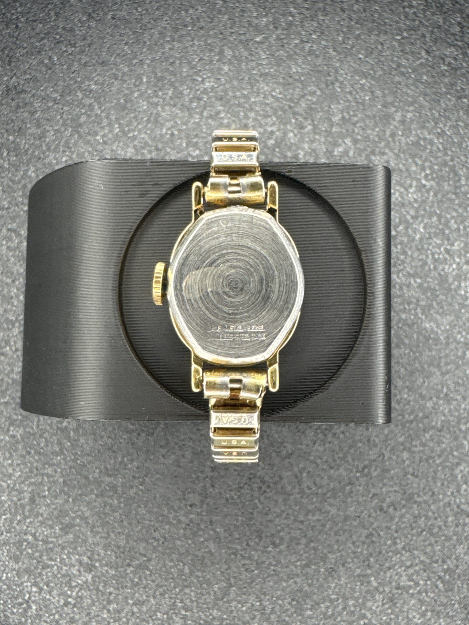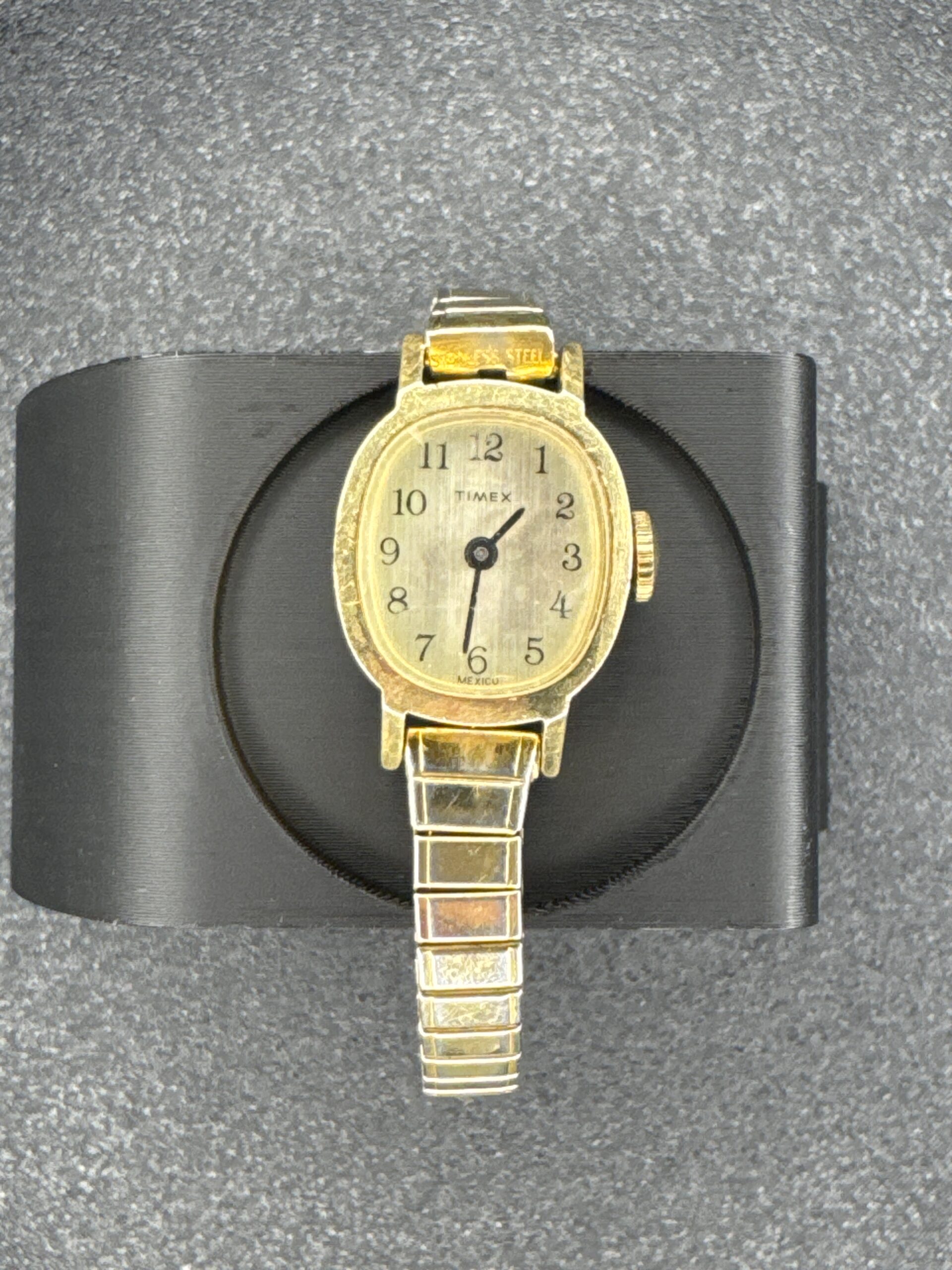 This vintage Timex women’s watch features a mechanical movement and a classic oval case design. The dial has a patina consistent with age, with Arabic numerals and simple black hands. The case and bracelet appear to be gold-toned, with visible wear and scratches, particularly on the case back. The watch is marked ‘Mexico’ on the dial, indicating its place of manufacture.