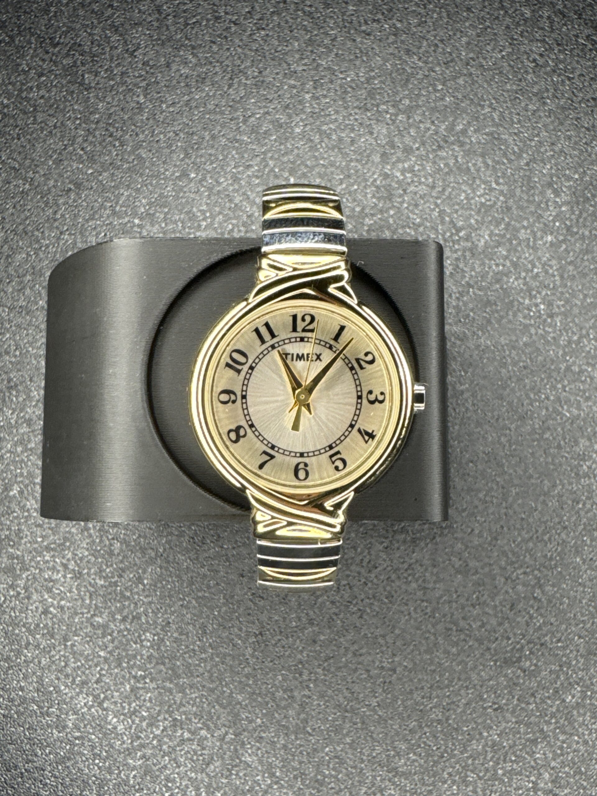 & Free ShippingTimex quartz women’s watch with gold-tone case and two-tone expansion bracelet. Features a textured dial with Arabic numerals.