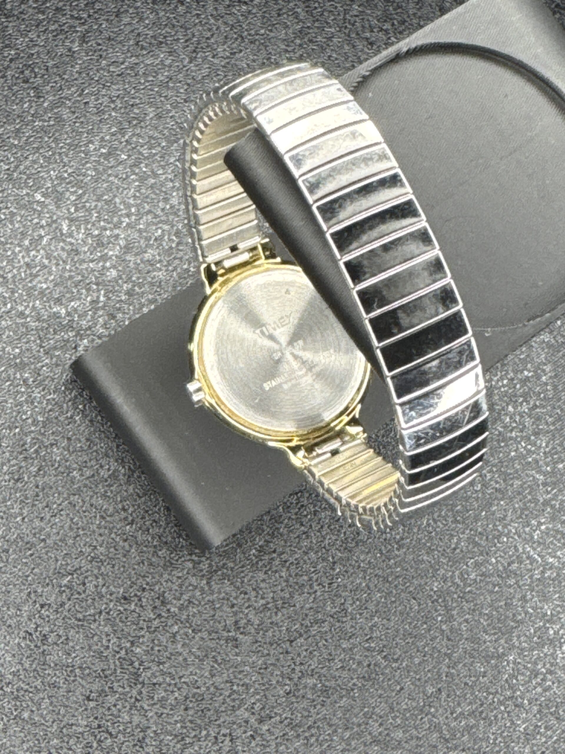 This Timex quartz women’s watch features a classic round gold-tone case with a textured dial and Arabic numeral hour markers. The watch has a two-tone expansion bracelet, combining gold and silver tones. The dial is simple and elegant, with a sunburst pattern that adds a touch of sophistication. The back of the watch is stainless steel, indicating durability and water resistance.