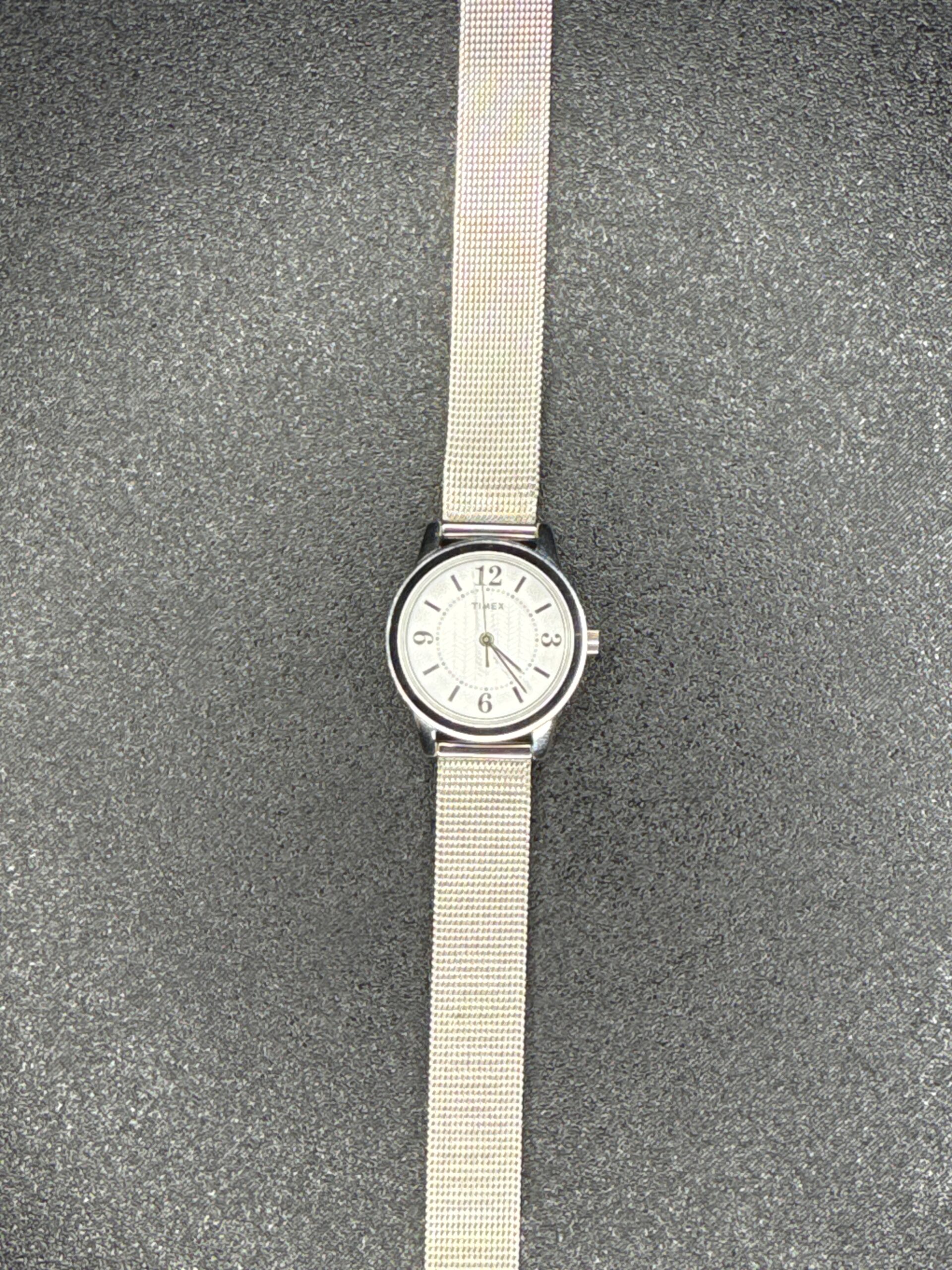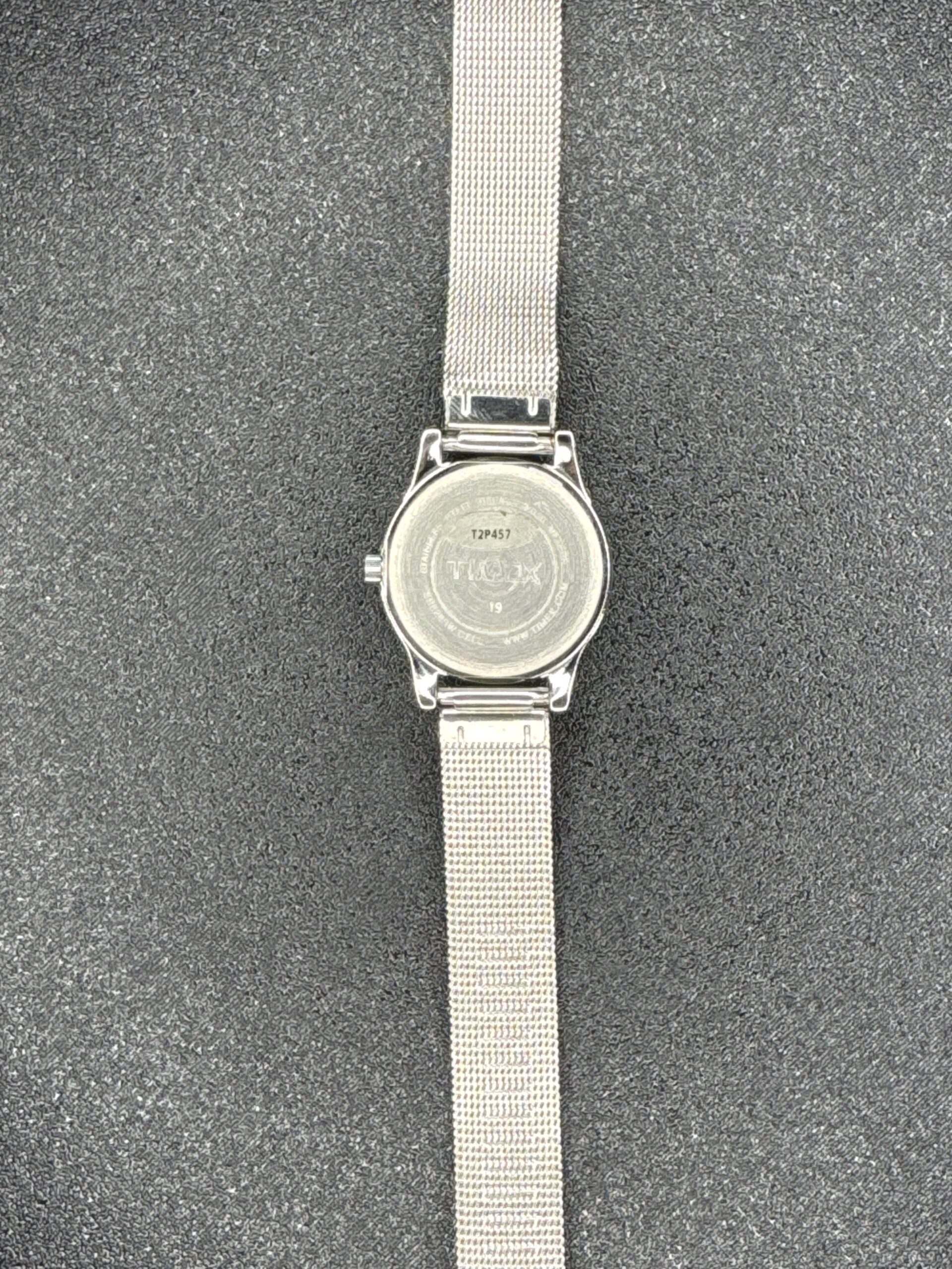 The Timex T2P457 is a women’s quartz watch featuring a classic silver-tone design. The watch has a round case with a white dial and Arabic numeral hour markers. The mesh band adds a touch of elegance and comfort. The back of the watch is marked with the model number T2P457, confirming its authenticity.