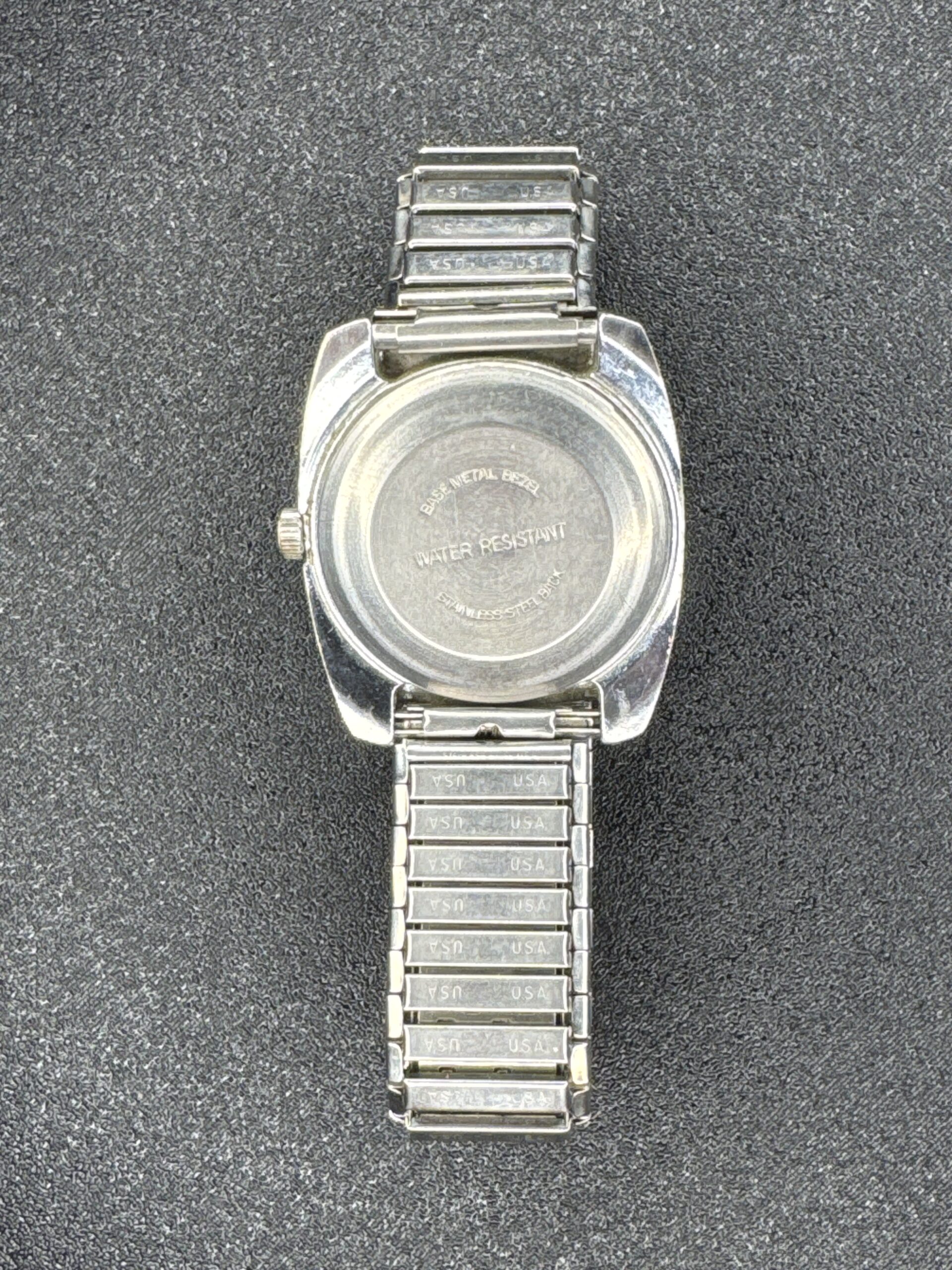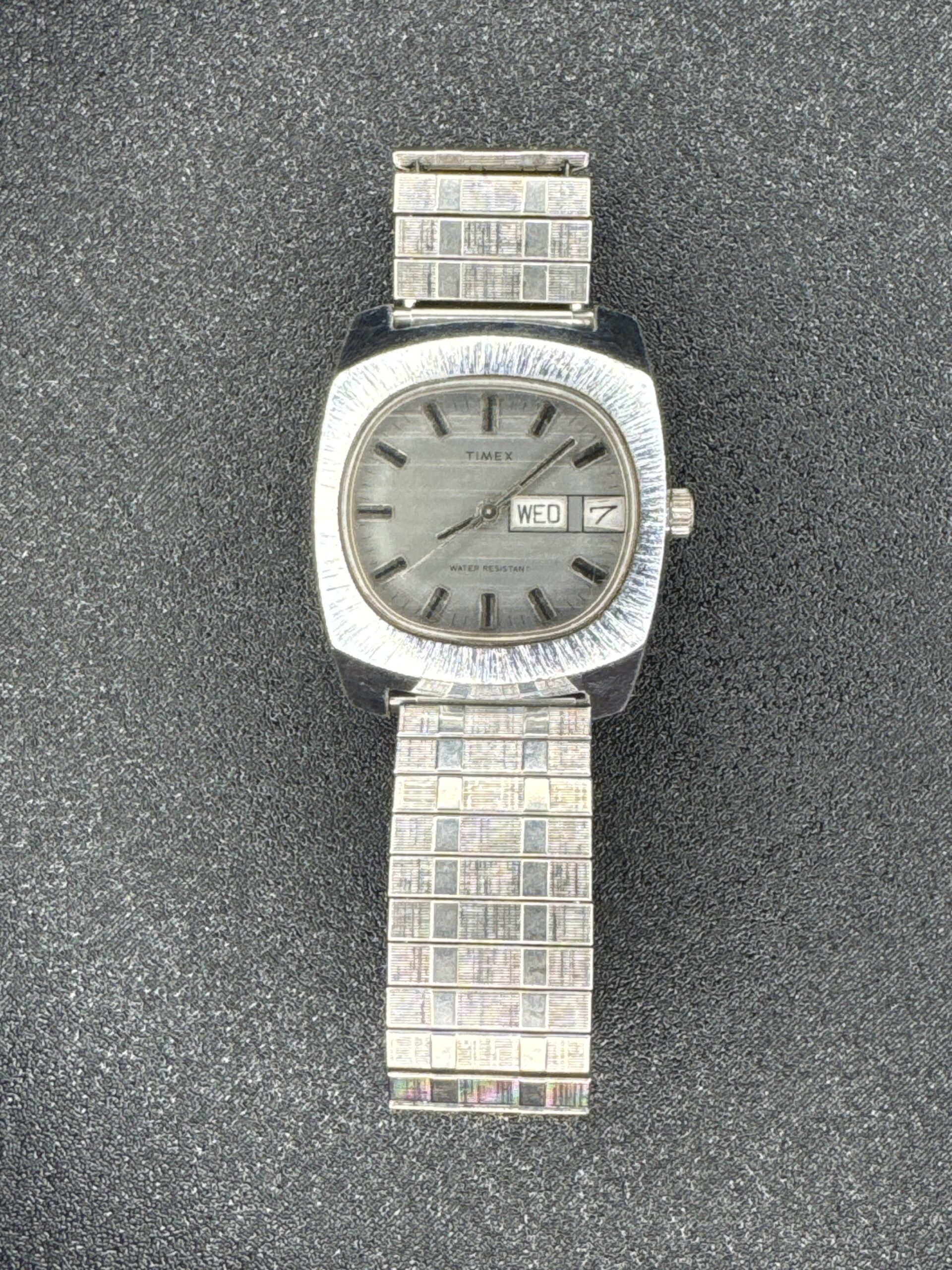 This Timex vintage mechanical men’s watch features a silver-tone case with a brushed finish and a matching silver dial. The dial includes a day-date function, with the day displayed in a window at the 3 o’clock position. The watch has a distinctive textured bracelet that complements the case design. The back of the watch is marked ‘Water Resistant’ and ‘Base Metal Bezel’, indicating its durability and construction materials.